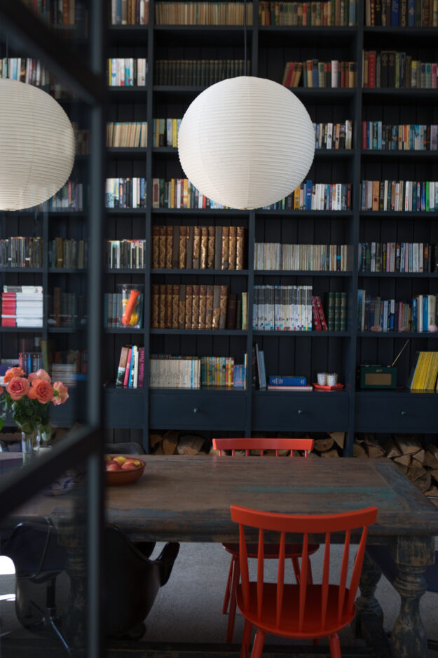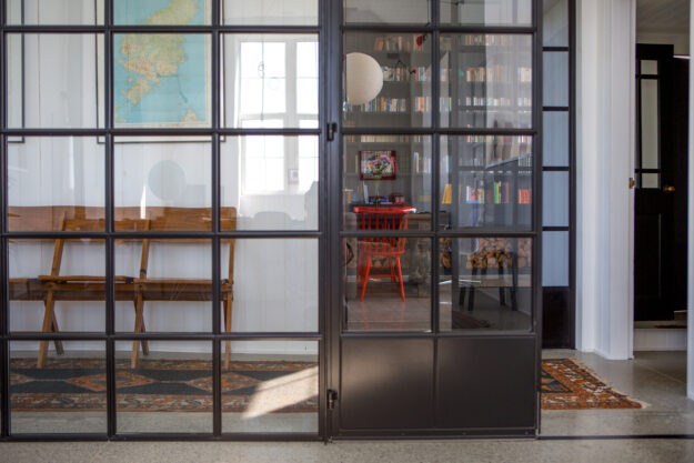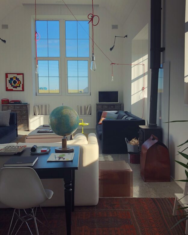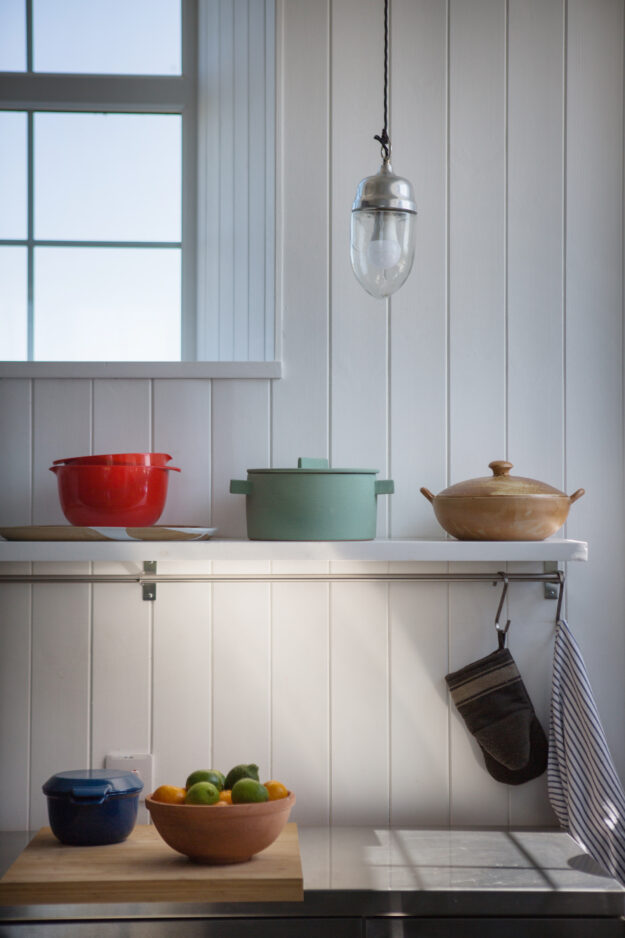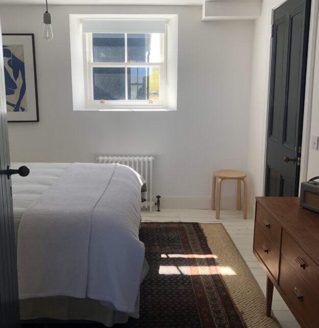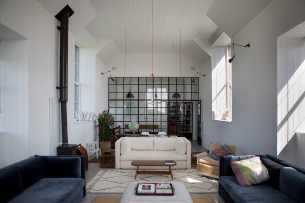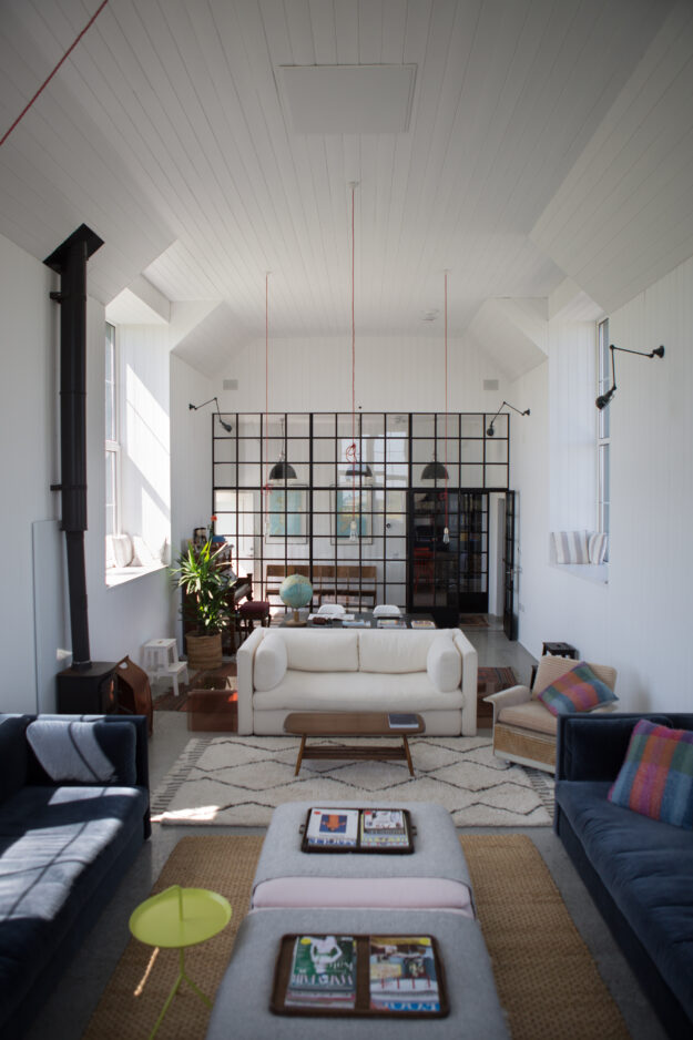 The interior finishes have been carefully selected to reflect the building’s former life as a school and its coastal location, whilst also channeling elements of mid-century Scandinavian design. Polished concrete floors, painted tongue and groove walls and Crittall panels set the tone of the old schoolrooms; while whitewashed floorboards, antique radiators and sash windows frame the simple seaside aesthetic of the former cottage. Throughout the house, vintage and salvaged pieces has been chosen to best compliment each of these style