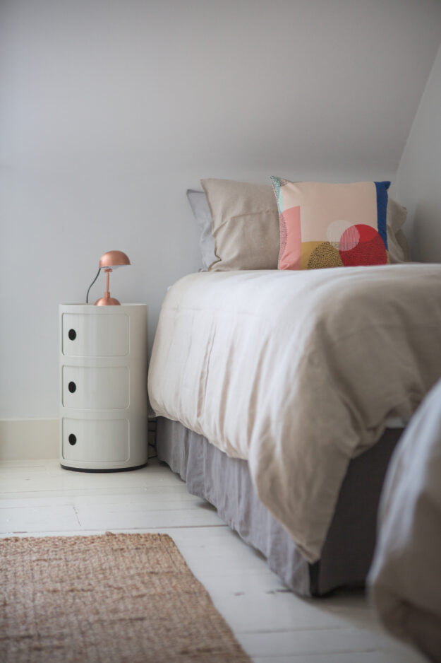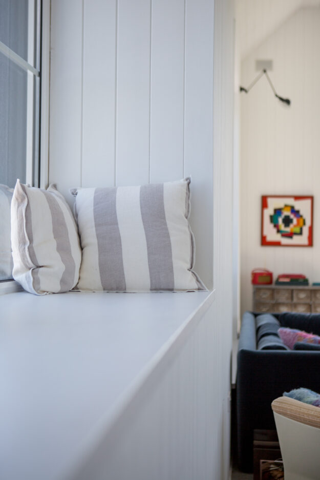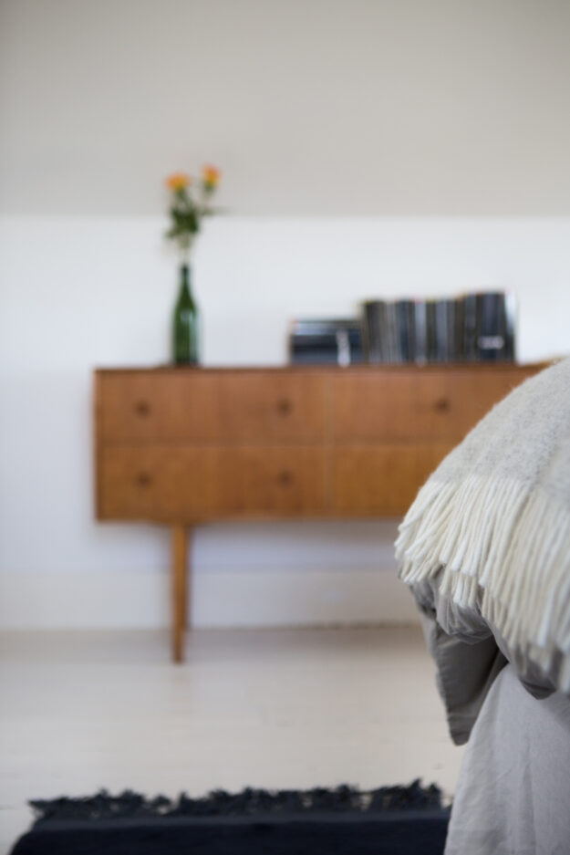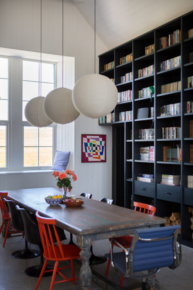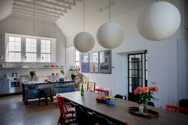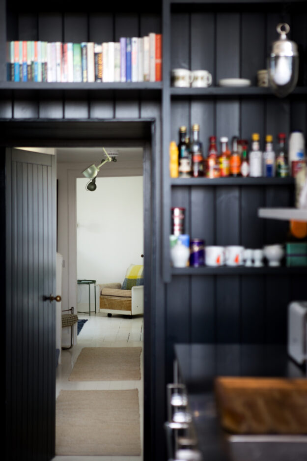 The interior finishes have been carefully selected to reflect the building’s former life as a school and its coastal location, whilst also channeling elements of mid-century Scandinavian design. Polished concrete floors, painted tongue and groove walls and Crittall panels set the tone of the old schoolrooms; while whitewashed floorboards, antique radiators and sash windows frame the simple seaside aesthetic of the former cottage. Throughout the house, vintage and salvaged pieces has been chosen to best compliment each of these style
